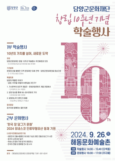 재단은 창립 10주년 기념을 위해 지난 6월 문화공연‘담빛 풍류’를 개최하여 군민이 예술로 어우러지는 자리를 마련한 데 이어, 이번 학술행사는 지역문화의 성장과 발전을 되돌아보고 미래의 비전과 핵심가치를 함께 공유할 수 있는 장으로 만들고자 한다.