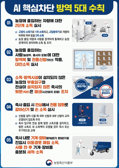 정광현 전남도 농축산식품국장은 “고병원성 조류인플루엔자 차단방역의 기본은 농장주가 기본 방역수칙을 철저히 지키는 것”이라며 “가금 농가는 외부인 출입통제와 소독, 전실 이용 등 농장에 병원체의 유입 방지를 위해 모든 노력을 다해달라”고 당부했다.