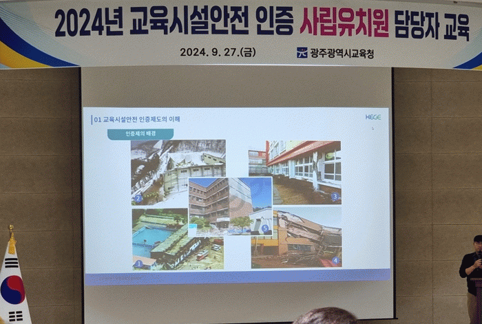 이번 교육은 사립유치원 담당자의 이해와 업무 역량을 제고하기 위해 마련됐으며, (사)한국교육녹색환경연구원 강사가 ▲교육시설안전 인증 제도 ▲자체평가서 작성 요령 ▲인증 신청절차 등을 안내한다.