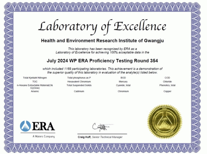광주보건환경연구원은 지난 2015년부터 해마다 이 평가에 참여, 9년 연속 ‘최우수 분석기관’ 인증을 획득했다. 이는 광주보건환경연구원의 분석 능력이 국제 기준에 부합하며, 신뢰성 있는 분석 결과를 지속적으로 제공하고 있음을 보여주는 성과이다.