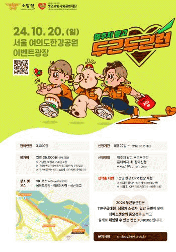 마라톤 코스는 총 9km로 1km마다 심폐소생술 단계를 학습할 수 있는 펀런(FUN RUN)의 형식으로 진행되며 자세한 일정은 QR코드 및 두근두근런 공식홈페이지에서 확인 가능하다.