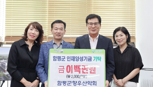 군에 따르면, 9월 30일 함평군향우산악회는 회원들의 뜻을 모아 함평 출신 후배들을 위해 장학금을 전달했다. 함평군향우산악회는 수도권에 거주하는 100여 명의 함평군 출신으로 구성된 단체로, 이번 기탁은 회원들이 십시일반 고향사랑의 마음을 모아 이루어진 것이다.
