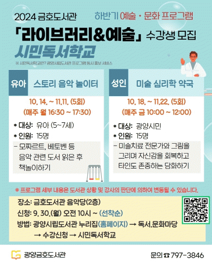 수강료는 무료이며, 9월 30일 오전 10시부터 광양시립도서관 누리집에서 신청할 수 있다. 프로그램에 대한 자세한 사항은 광양금호도서관으로 문의하면 된다.