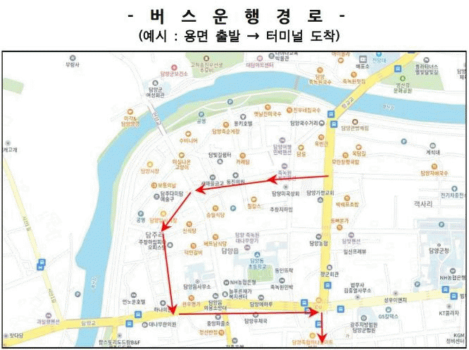 또한 담양 임시시장이었던 삼거리에 버스 표지판을 설치하고, 장날 한쪽 방면 주.정차 안내 현수막 게시, 도로 모퉁이 러버콘 설치 등으로 차량 흐름을 원활하게 해 버스 이용객의 편의를 높이고자 한다.