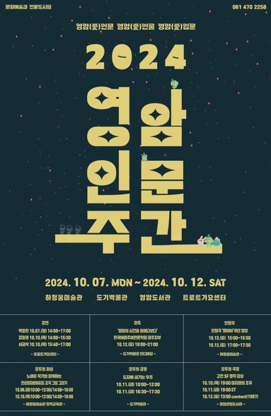 영암군에서 처음 열리는 이번 인문주간은 ‘영암愛인문 영암愛인물 영암愛입문’을 주제로 지역 주요 문화 거점 기관에서 강연·체험·공연·관측 등을 진행한다.