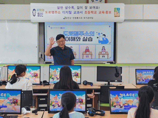 이번 교육은 작천초를 시작으로 마량초, 강진동초 내 전산교육장에서 도로명주소 내용을 효과적으로 이해하고 학습하기 위해 개발된 메타버스 플랫폼 기반 디지털교과서인 ‘지니버스’를 활용해 진행됐다.