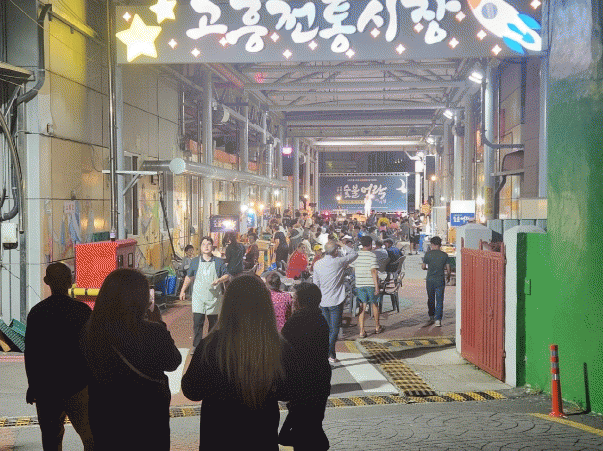 야시장은 숯불구이로 특화된 고흥전통시장의 특징을 살려 숯불 생선구이, 숯불 족발, 숯불 전어구이, 숯불 오징어구이 등 다양한 먹거리를 제공하며, 편안하게 음식을 즐길 수 있도록 테이블, 의자, 텐트도 설치했다.