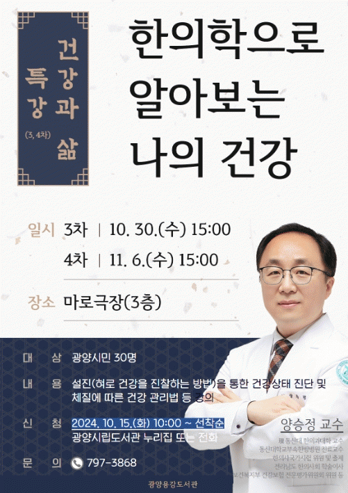 참여 신청은 오는 10월 15일 오전 10시부터 광양시립도서관 누리집이나 전화로 신청할 수 있으며, 선착순으로 30명을 모집하니 관심 있는 시민들의 많은 신청을 바란다.