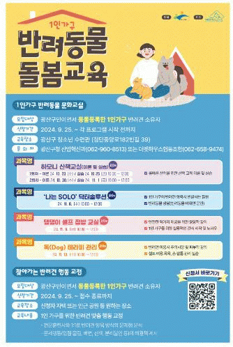 반려동물 문화교실은 광산구 청소년 수련관에서 △‘나는 SOLO’ 닥터 솔루션 △댕댕이 자가(셀프) 집밥 교실 △독(Dog) 요법(테라피) 관리 △하모니 산책교실(이론?실습, 2회) 등 총 4개 과목을 진행한다.