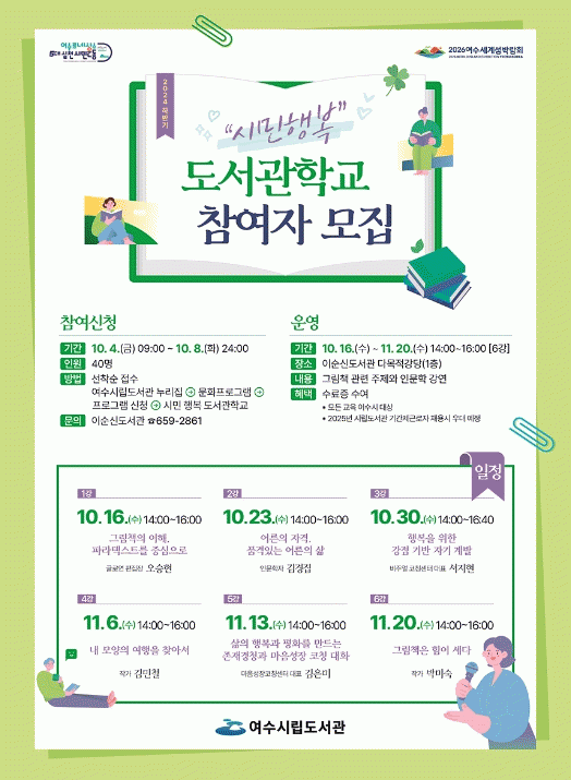 교육 참여를 희망하는 시민은 4일부터 여수시립도서관 누리집에서 신청하면 된다.