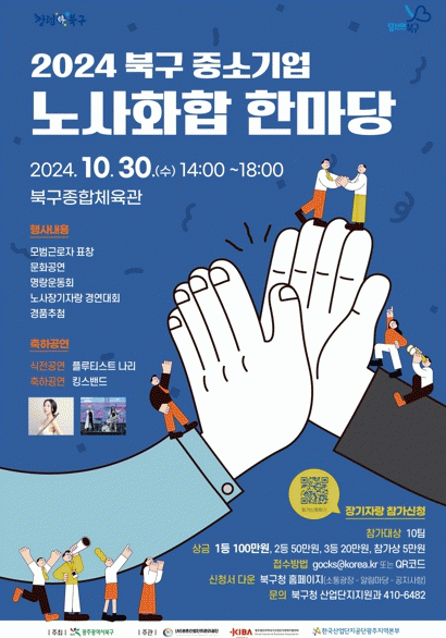경연대회 참가자 모집은 현재 선착순으로 접수 중이며 참여를 희망하는 중소기업 종사자는 행사 웹 포스터 QR코드를 통해 신청하면 되고 기타 자세한 사항은 북구청 산업단지지원과에 문의하면 된다.