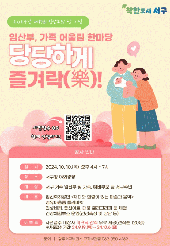 이날 행사는 서구청 야외광장에서 임산부 및 가족 등을 대상으로 오후 4시 30분부터 ▲태교존 ▲당당존 ▲당근존 ▲부대행사 존으로 나뉘어 진행된다.