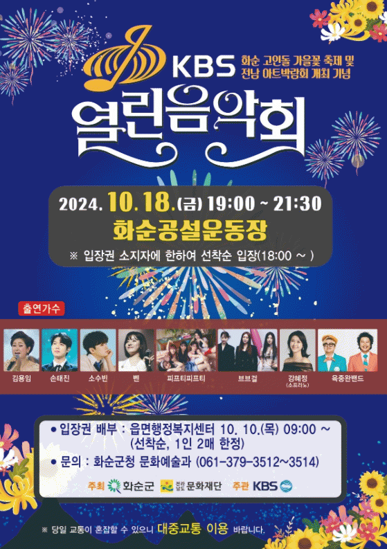 구복규 화순군수는 “화순 고인돌 가을꽃 축제 및 전남 아트박람회 ART 061 개최 기념 ‘KBS 열린음악회’에 화순군민과 인근 지역 주민들을 초청하고자 한다”라며, “음악회와 가을꽃 축제를 함께 즐길 수 있는 자리가 되길 바란다”라고 말했다.
