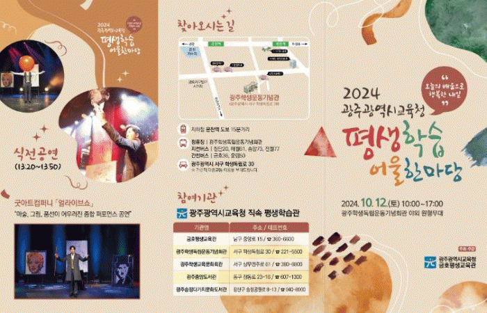 ‘평생학습 어울 한마당’은 시교육청 평생학습관으로 지정된 금호평생교육관, 광주학생독립운동기념회관, 광주학생교육문화회관, 광주중앙도서관, 광주송정다가치문화도서관 등 5개 기관이 평생교육 프로그램 학습 결과물을 공유하는 자리다.
