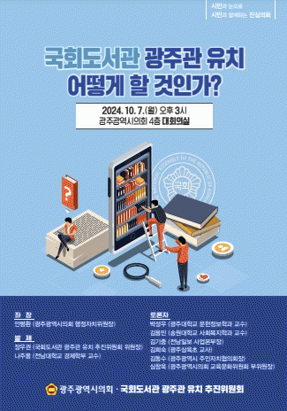 안평환 위원장이 좌장을 맡고 장우권 국회도서관 광주관 유치 추진위원회 위원장과 나주몽 전남대학교 경제학부 교수가 발제했다. 이어 박성우 광주대학교 문헌정보학과 교수, 김용민 송원대학교 사회복지학과 교수, 김희숙 광주삼육초 교사, 김동수 광주시 주민자치협의회장, 심창욱 광주시의회 교육문화위원회 부위원장이 토론자로 참여했다.