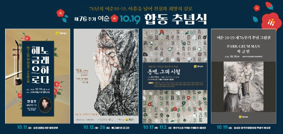 12일부터 26일까지 여수 에그갤러리에서는 이인혜 작가의 ‘기도, 1948’ 주제 그림전이 열리고, 17일부터 11월 2일까지 여수 엑스포 국제관 카멜리아 갤러리에서 여순사건 유족이 활동하는 ‘소석회’ 회원들의 민화 특별전도 선보인다.