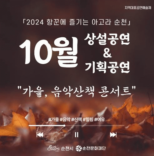 순천문화재단 관계자는 “이번 공연은 순천의 대표 관광지와 시민들이 일상 속에서 문화예술을 즐길 수 있는 장소에서 진행될 예정”이라며 “가을 정취를 만끽할 수 있는 시간이 되길 바란다”고 전했다.