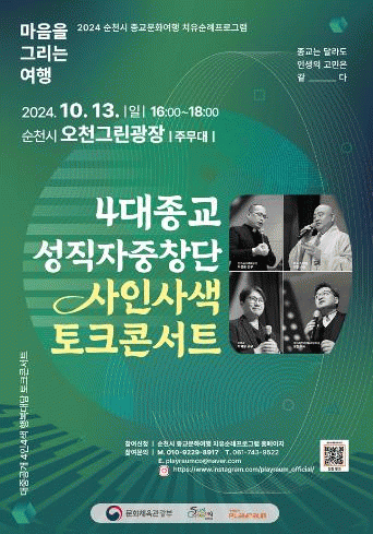 시에 따르면 2024 순천 세계유산축전과 함께 오천그린광장에서 진행되는 토크콘서트는 ‘만남중창단’의 멤버인 4분의 종교계 인사가 참석해 노래와 대화 형식으로 진행된다.