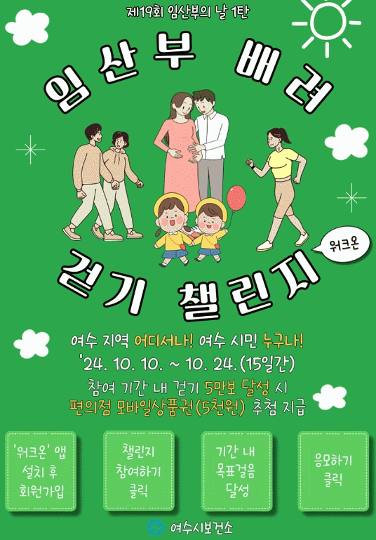 이에 여수시는 오는 10일부터 24일까지 15일간 ‘워크온’ 앱을 통해 ‘임산부 배려 걷기 도전 잇기(챌린지)’를 운영한다.