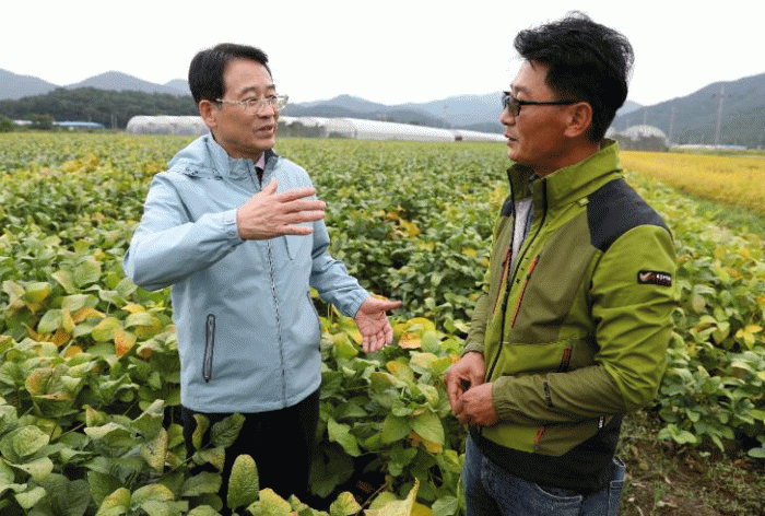 강진원 군수는 벼 대체 소득작물로 집중 육성 중인 논콩 재배의 현황을 파악하고 재배 농가의 어려움을 살피기 위해 논콩 전문 단지 회원들과 만나 소통했다.