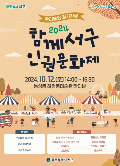 김이강 서구청장은 “이번 인권문화제는 단순한 행사를 넘어 인권이 우리 삶의 중심에 있음을 보여주는 축제의 장이 될 것이다”며 “많은 분이 참여해 인권에 대해 생각하고 즐거운 시간을 누리시길 바란다”고 말했다.
