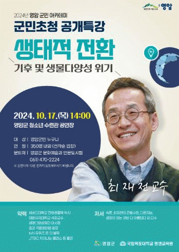 영암 특강에서 최 교수는 현재 인류가 직면한 가장 심각한 문제인 기후와 생물다양성 위기의 실상을 알리고, 지속가능한 미래의 삶을 확보하기 위한 대안으로 ‘생태적 전환’을 제시할 예정이다.