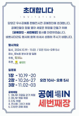 한편, 담양군 공예센터 ‘장인각’에서도 19일부터 31일까지 담양군공예인협회 회원전이 열려 50여 점의 우수한 지역의 공예 작품을 감상할 수 있다.