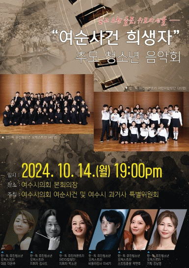 여수시의회는 오는 10월 14일 오후 7시 본회의장에서 76년 전 여순사건으로 무고하게 희생당한 영령들을 추모하고 유족들의 아픔을 치유하기 위한 음악회를 개최한다고 밝혔다.