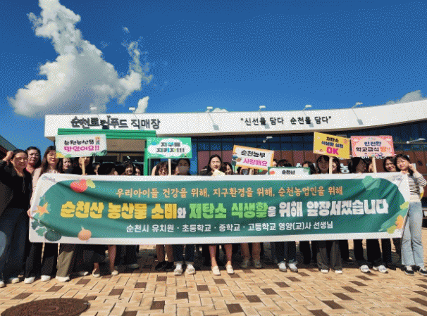 이번 캠페인에는 유치원, 초등학교, 중학교, 고등학교 영양(교)사와 학교급식 업무를 담당하는 교육청 관계자 등 40여명이 참여했으며, 순천로컬푸드㈜ 국가정원점 인근에서 지역 농산물 소비 촉진 결의를 다지는 시간을 가졌다.