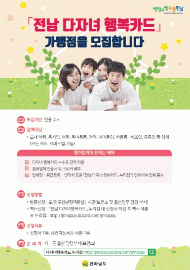‘전남 다자녀 행복카드’는 양육비 부담을 덜어주고 출산 친화적인 분위기를 조성하기 위해 지난 2008년부터 전라남도와 농협이 협약을 맺어 운영해오고 있는 사업이다.