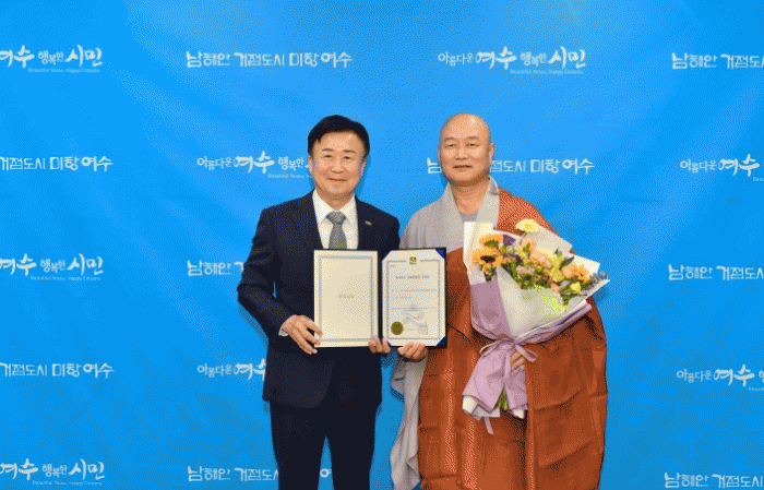 시장실에서 열린 전달식에 정기명 시장과 달마사 주지 도해스님이 참석한 가운데, 정 시장은 달마사 소장본의 문화유산 지정을 축하하며 지정서를 직접 전달했다.