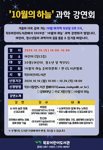 ‘10월의 하늘’ 과학 강연회는 소도시 지역민을 대상으로 각계 각층의 과학자, 전문가들이 직접 찾아가 무료로 진행하는 과학 강연으로 지난 2010년부터 15년째 이어오고 있다.