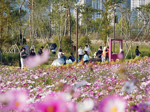 만개한 코스모스는 낮에는 반짝이는 영산강, 밤에는 꽃길 사이를 비추는 야간조명과 함께 어우러져 환상적인 가을 정취를 선사했다.