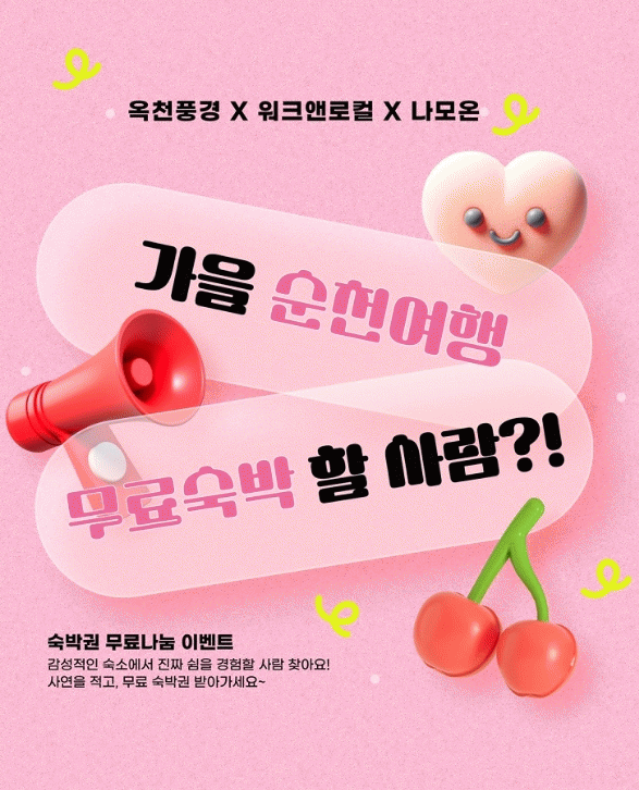 이벤트 참여 방법은 워크앤로컬·옥천풍경·나모온의 인스타그램 계정을 팔로우하고, ‘향동 소재 한옥펜션에서 하룻밤을 보내고 싶은 이유'를 댓글로 남긴 후 친구를 태그하면 응모가 완료된다.