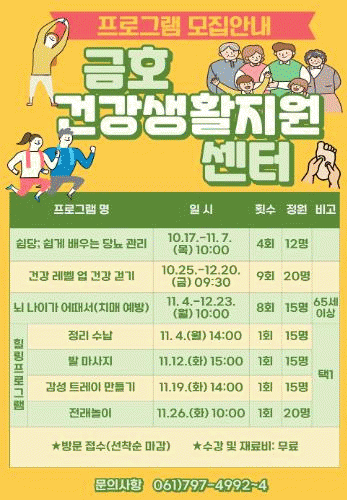 건강생활지원센터 관계자는 “프로그램별로 모집 내용이 상이하므로 자세한 내용은 미리 전화 문의하신 후 센터에 방문 신청하시기 바란다”라고 전했다.