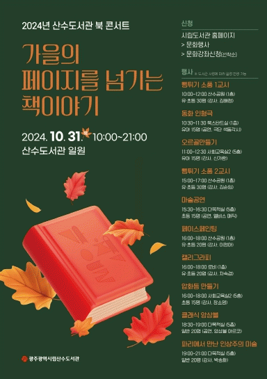 행사 참여는 광주시립도서관 누리집(문화행사/문화강좌신청/산수)으로 신청하면 되며, 자세한 내용은 산수도서관로 문의하면 된다.