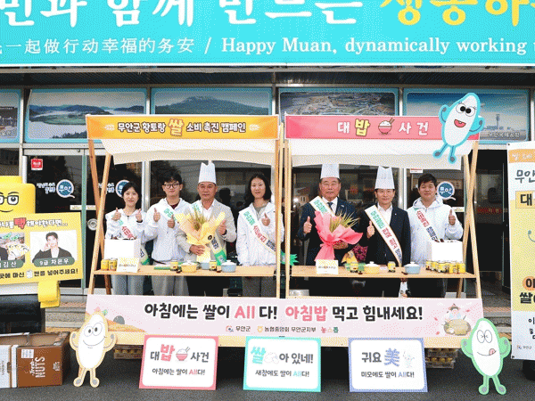 김산 군수와 이호성 무안군의회 의장, 김해종 농협무안군지부장은 컵밥과 쌀 음료를 직원들에게 함께 나누어 주며 아침밥 먹기 중요성을 설명하고 쌀 소비를 독려했다.