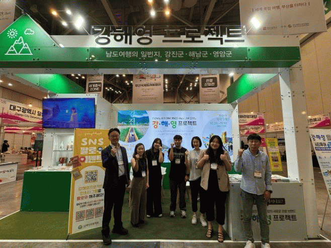 트래블쇼 2024 강해영 홍보관에서는 지역의 특색을 알릴 수 있도록 세 지역 막걸리와 해남 고구마 등 농산물, 강진 청자, 영암 달마지쌀 등을 전시했으며, 강해영 공식 SNS 팔로우 이벤트 참여를 희망하는 방문객들로 북적였다.
