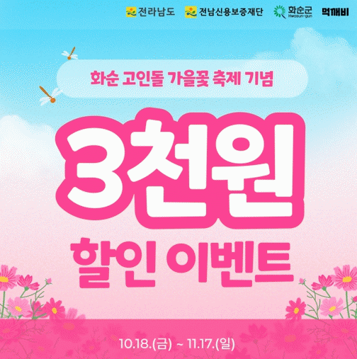 박용희 지역경제과장은 “이번 화순 고인돌 가을꽃 축제를 맞아 지역 소상공인도 상생할 수 있도록 공공 배달앱 할인 이벤트를 추진한다”라며, “소상공인의 경영 안정에 큰 도움이 되는 공공 배달앱 ‘먹깨비’를 많이 이용해 주시면 좋겠다”라고 말했다.