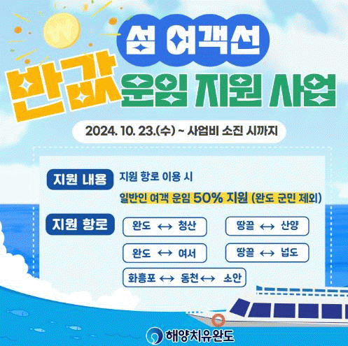 올해 초 시행된 ‘반값 여객선 운임제’는 관광객 방문 증가로 사업이 조기 마감됐으나, 추가 예산을 확보해 10월 23일부터 약 2주간 지원이 가능할 것으로 보인다.