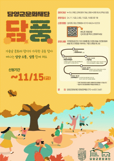 프로그램은 11월 1일, 11월 2일, 11월 15일, 11월 16일 오전 11시부터 오후 4시 반까지 운영되며, 4일 중 1일을 택해 참여할 수 있다. 모집은 선착순으로 진행되며 참여일 전까지 QR코드(구글폼)나 전화로 신청하면 된다.