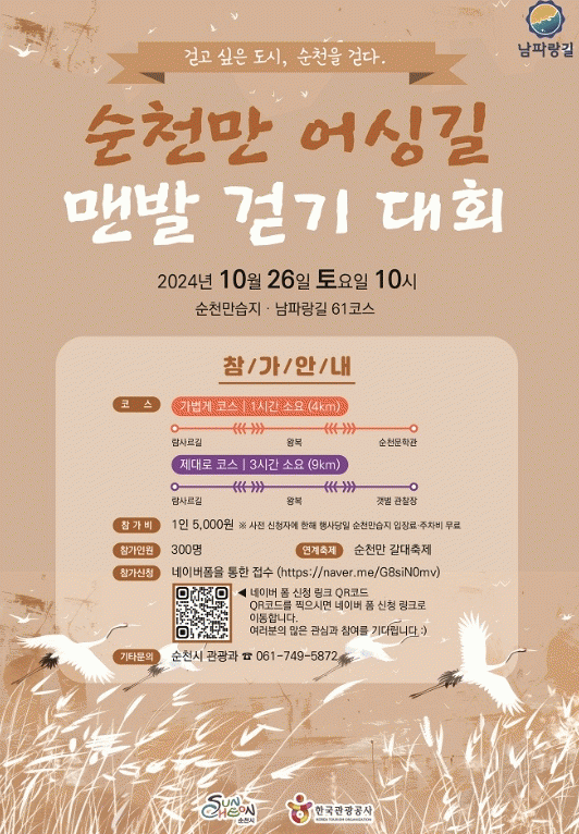 참가비는 5,000원으로 사전 접수자에 한 해 행사 당일 순천만습지에 무료로 입장할 수 있다.