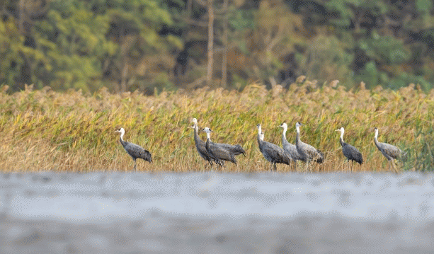 흑두루미 13마리 중 2마리는 어린 새로 러시아 시베리아에서 어미 새와 70여 일 동안 2,500㎞를 날아 순천만에 도착한 것이다.