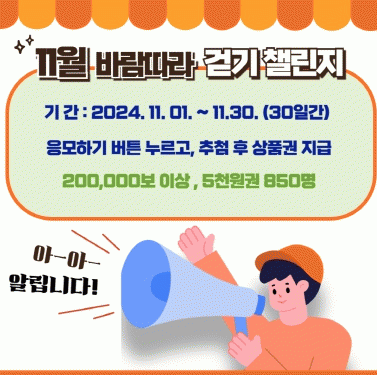 이번 걷기 챌린지 운영 기간은 11월 1일부터 11월 30일까지다. 참여를 원하는 광양시민은 모바일 걷기 앱 ‘워크온’을 설치하고 ‘광양시 공식 커뮤니티’에 가입한 후 챌린지 탭에서 광양시 걷기 챌린지 ‘참여하기’를 누르면 참여 신청이 완료된다.
