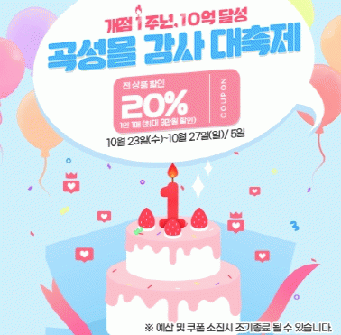 고객 성원에 보답하고자 곡성몰에서는 10월 23일부터 10월 27일까지 ‘개점 1주년, 매출 10억 달성 기념’ 곡성몰 감사 대축제 전 품목 20% 할인 행사를 진행한다. 또한 고객과 함께 곡성몰 1주년을 축하하고자‘삼행시 이벤트’를 통해 20명에게 단감 5kg을 증정한다.