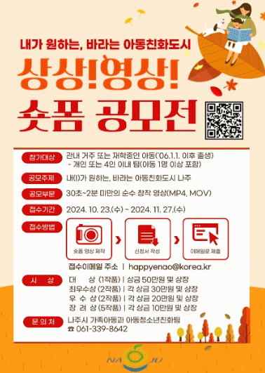 전라남도 나주시(시장 윤병태)는 오는 11월 27일까지 아동친화도시 나주를 주제로 숏폼 영상 공모전 작품을 접수한다고 23일 밝혔다.