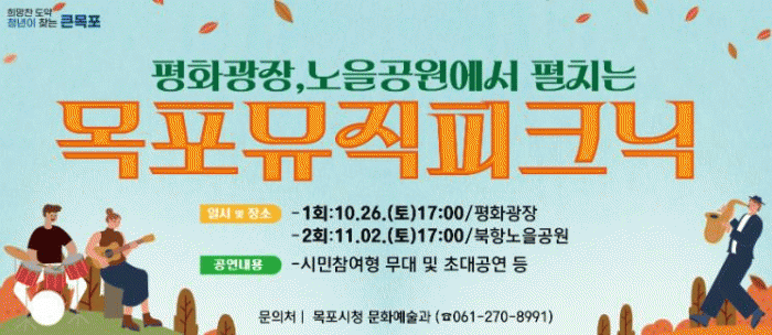 시 관계자는 “이번 문화예술행사의 시민 참여자들에게 즐겁고 유쾌한 소통의 장이 되기를 바라며, 관람객들에게도 운치 있는 목포의 낭만 선율을 느낄수 있는 기회가 되기를 바란다”고 말했다.