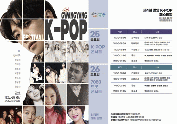올해로 4회를 맞는 광양 K-POP 페스티벌은 25일, 26일 양일간 개최되며 25일에는 비, QWER, 하이키, 이채연, 브브걸, 26일에는 박정현, 신용재, 장윤정, 김연자 등이 화려한 무대를 펼칠 예정이다.
