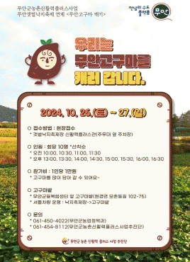 축제 연계행사로 진행되는 고구마 캐기 체험은 주무대 옆 신활력플러스사업성과 홍보관 부스에서 현장 접수를 통해 누구나 바로 참여할 수 있으며 체험료는 1만원이다.