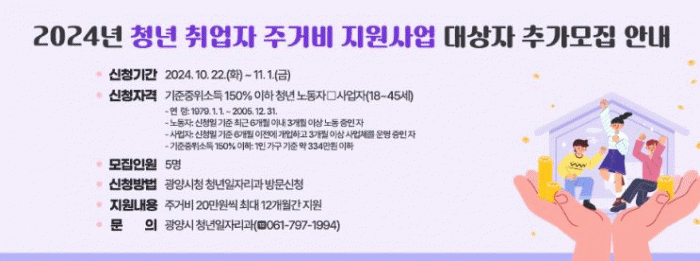 신청 자격은 ▲광양시에 주소를 둔 18세 이상 45세 이하 노동자, 사업자 ▲전세 대출금 5천만 원 이상 또는 월세 60만 원 이하 주택에 거주하는 무주택자 ▲가구소득인정액이 기준중위소득 150% 이하인 자다.